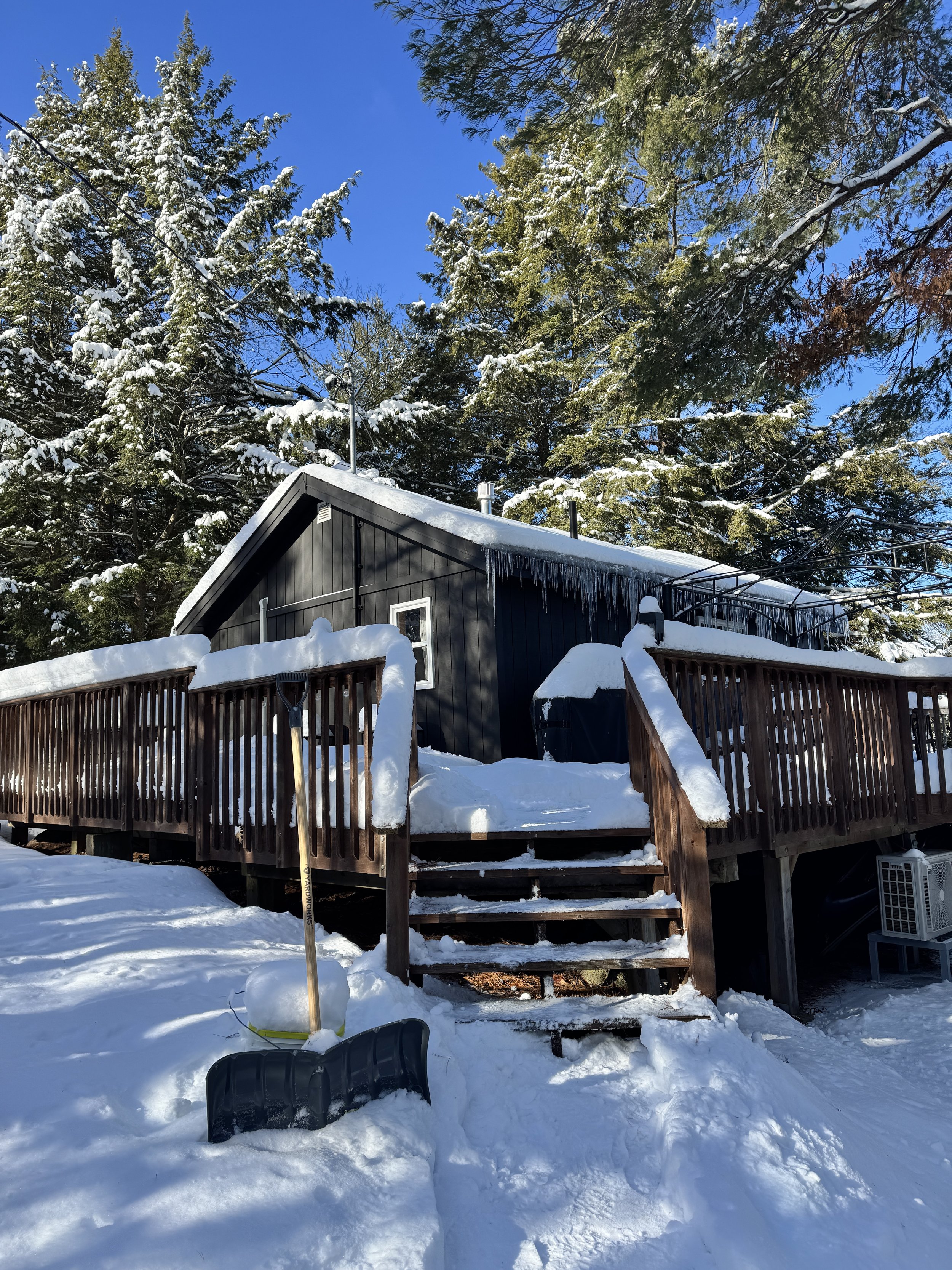 The cottage can be accessed during the winter months with some added care. Every effort is made to clear a pathway to the main cottage door before arrival however snowfall can be unpredictable and, if weather hits, there may be some snow to clear. Use the deck area (pathway to the right of the entrance staircase) to access the main door (this keeps you on a level surface). A shovel is left at the base of the stairs as well as at the main cottage door.